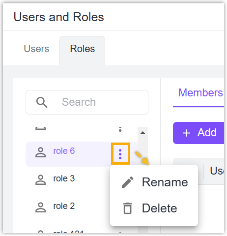 - Select the desired role in the left role list, go to Members page and click Add to add users.