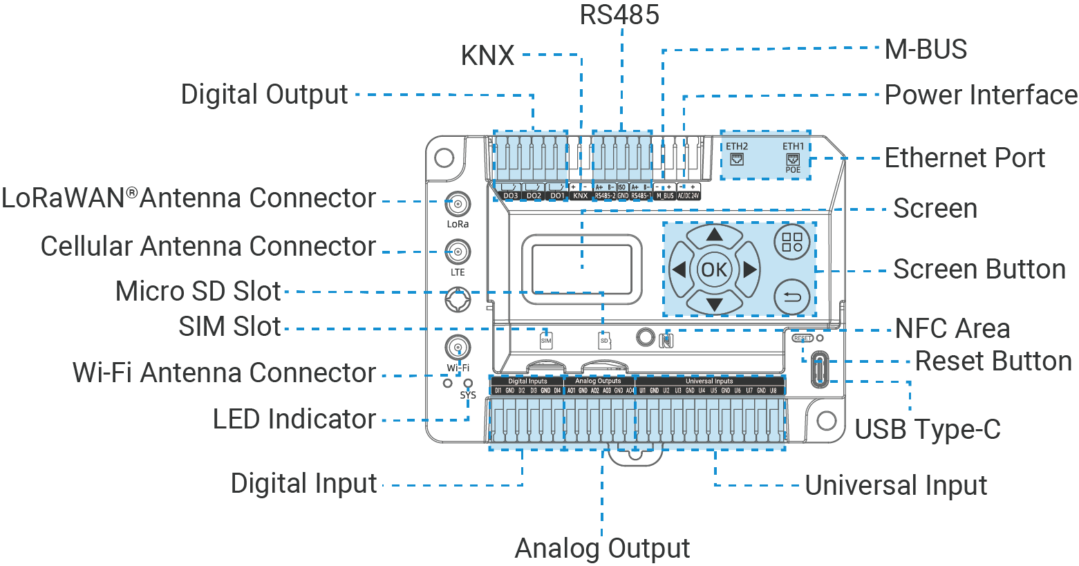 | LoRaWAN® Antenna Connector | Allows connection of external antennas to enhance wireless communication range and reliability. |