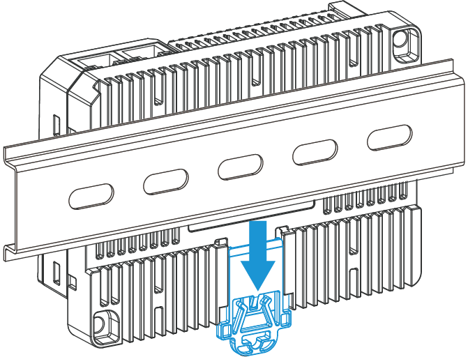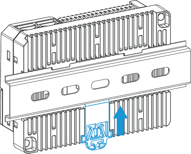 - Push up the locking clip to secure the device to the DIN