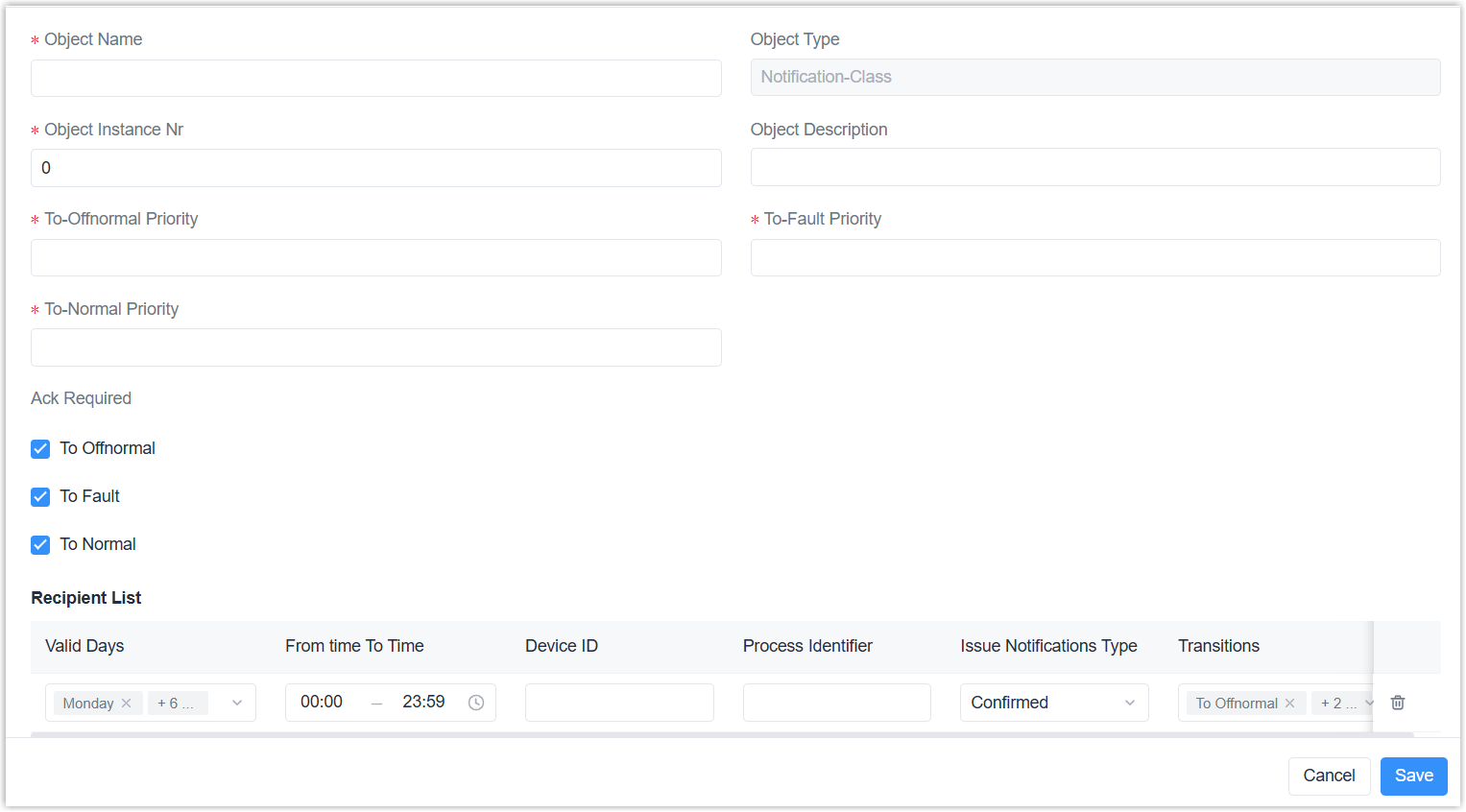 Parameter Description Object Name Define a unique name for this object. Object Type It is fixed as Notification-Class. Object Instance Nr Set a unique object instance number. Object Description For noting this object. To-Offnormal Priority Set the priority number used by recipients to sort event notifications. Range: 0-255 (0 being most important, 255 least important) To-Fault Priority To-Normal Priority Ack Required Specify if this event requires the recipient to send the Acknowledgement Alarm message back to gateway. Recipient List When event is triggered, the event notification will be sent to recipients in this list. One list supports to add 10 recipients at most. Valid Days: Valid days to send notifications.