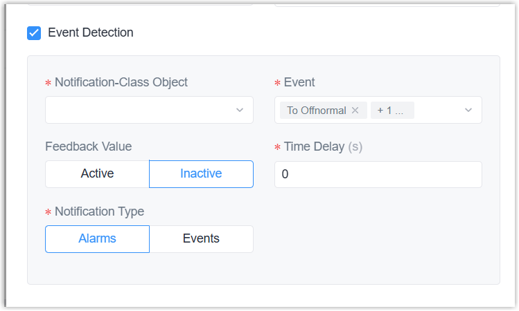 Parameter Description Notification-Class Object Select the notification class to determine the recipients and other alarm configuration. Event Select the event type to report. Time Delay Only when current value matches the threshold condition or is out of threshold for this time, the device will report the corresponding event. Notification Type Select the notification type as Alarms or Events. Object Type is Analog Input/Output/Value Limit Event Select if reporting the event when reaching the high limit or low limit. High Limit Define the high limit threshold value. Low Limit Define the low limit threshold value. Deadband Under To Offnormal status, when current value returns to (high limit - deadband) value or (low limit + deadband) lasting the delay time, the device will generate To Normal event. Object Type is Binary Input/Output/Value Alarm/Feedback Value Report To Offnormal event if the current value is equal to this value for delay time; report To Normal event if the current value is not equal to this value for delay time. Object Type is Multi-State Input/Output/Value Alarm Value For Multi-State Input/Value, report To Offnormal event if the current value is equal to alarm value for delay time; report To Normal event if the current value is not equal to alarm value for delay time. Fault Value For Multi-State Input/Value, report To Fault event if the current value is equal to fault value. Feedback Value For Multi-State Output, report To Offnormal event if the current value is equal to feedback value for delay time; report To Normal event if the current value is not equal to feedback value for delay time. - Click Save to save the object settings.