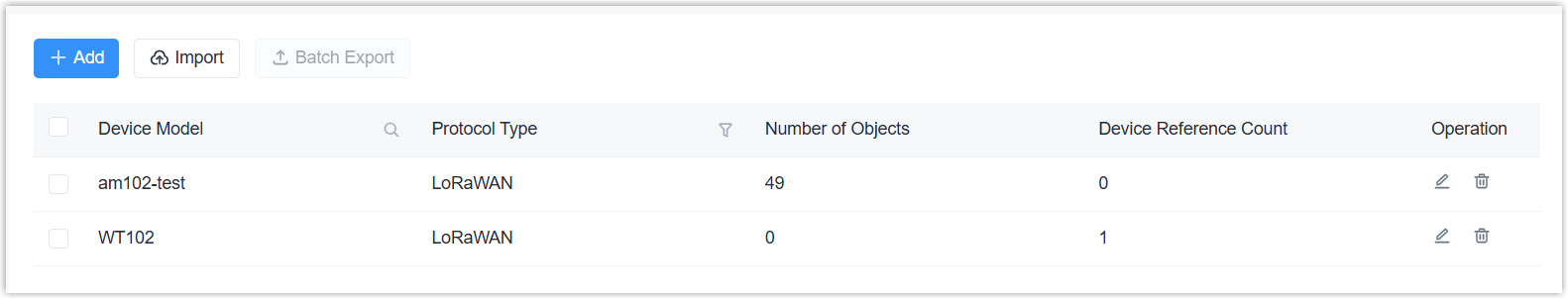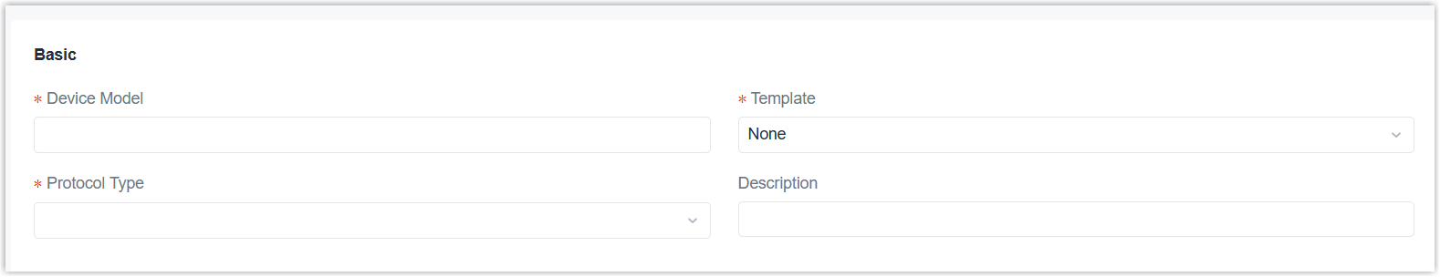 Parameter Description Device Model Set the device model name. Template Select a template from inbuilt device repository. This is suitable for adjusting custom content to Milesight LoRaWAN® device models. For third-party devices or other protocol types, select None. Protocol Type Select the protocol type of the device model. Description For noting this device model. Protocol type is LoRaWAN® DevEUI Prefix (9 chars) Set the first 9 characters of the device EUI. Device-Profile Select the device profile of this model. - Add a payload decoder and encoder for LoRaWAN®-type devices. For other