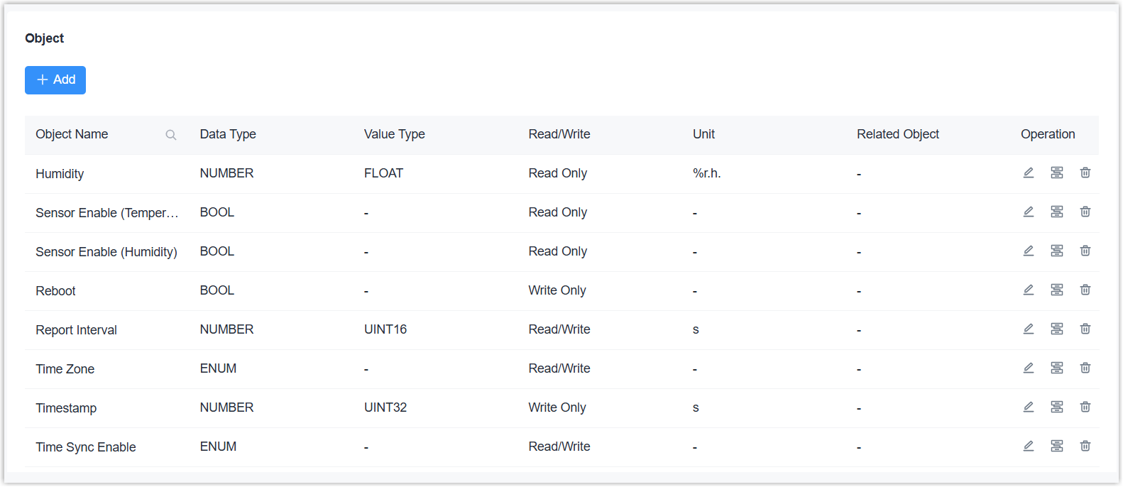 TEXT: Set the maximum length of the string.Read/Write Select the access mode of this object. BACnet Forward BACnet Forward Enable or disable to convert this object to BACnet object. Object Type Select BACnet object type. After selecting the Data Type and Read/Write options, the device matches the object type and parts of BACnet parameters automatically. Polarity Select the binary input/output/value status as Normal or Reverse. Active Text Add the text to indicate the active status for Binary Input/Output/Value types. It is the same as Value 1. Inactive Text Add the text to indicate the active status for Binary Input/Output/Value types. It is the same as Value 0. Number of States Set the number of status when object type is MultiState type. It is the same as Enumeration Number. State Text: Add the text to indicate every status. It is the same as Enumeration Value.