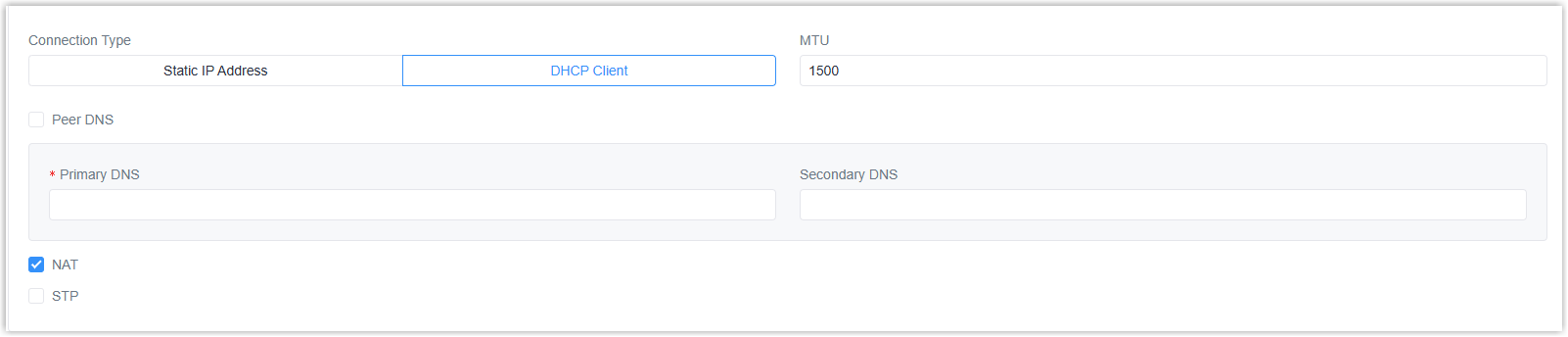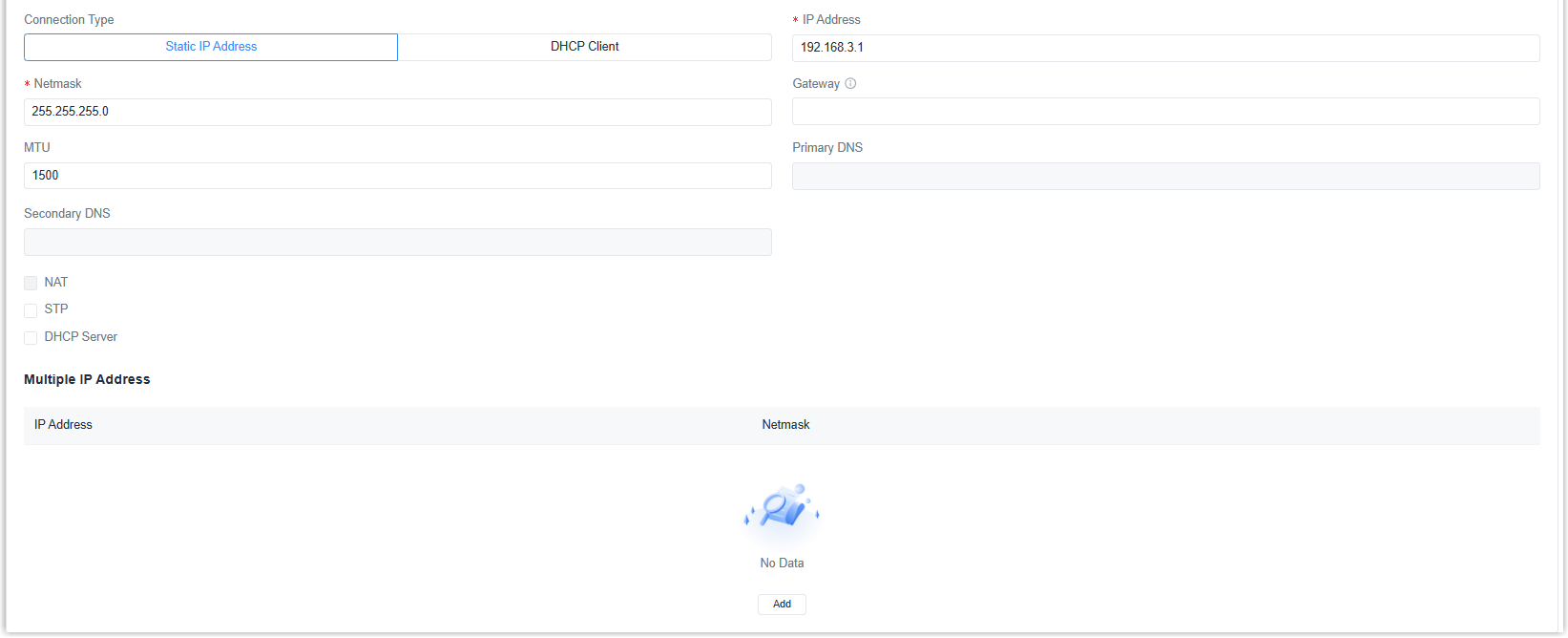 Parameter Description IP Address The IPv4 address of this interface. The address must be in the same subnet as the gateway address when it needs to connect to the external network. Netmask The IPv4 netmask of this interface. Gateway Enter the IPv4 gateway address of this interface when it needs to connect to the external network. MTU The maximum transmission unit of the packets passing this interface. Primary DNS When gateway address is typed, set the primary DNS server address. Secondary DNS When gateway address is typed, set he secondary DNS server address. NAT When gateway address is typed, enable or disable NAT for this interface. STP Disable or enable STP for this interface. Multiple IP Address Click Add to add extra IP address and netmask for this interface. DHCP Server DHCP Server Enable the DHCP server to assign IP address to connected client devices automatically. If disabled, the client devices are required to configure their own IP addresses. Start Address Set the start IP address of the IP range to assign IP addresses. End Address Set the end IP address of the IP range to assign IP addresses. Lease Time Set the lease time during which the client can use the IP address from the DHCP server. After this time, the client has to request a new lease. Primary DNS The primary DNS server address. Secondary DNS The secondary DNS server address if the primary DNS server does not work. Windows Name Server Define the Windows Internet Naming Service obtained by DHCP clients from the DHCP server. Generally, you can leave it blank. MAC Binding Click Add to bind the specific IP addresses to specific clients by client MAC addresses. - DHCP Client