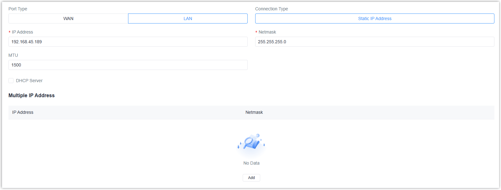 | Multiple IP Address | Click Add to add extra IP address and netmask for this interface. |