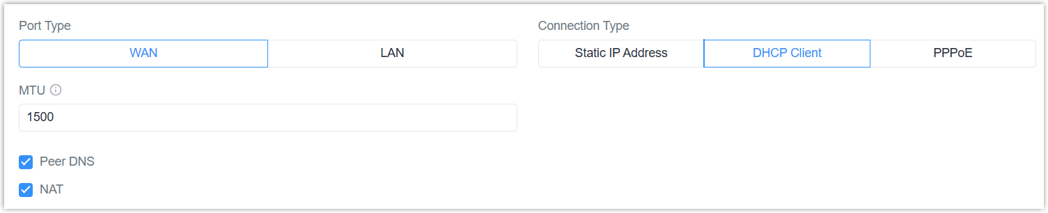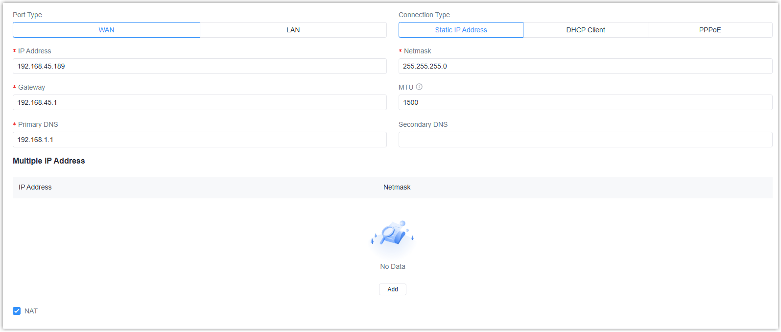 Parameter Description IP Address The IPv4 address of this interface. The address must be in the same subnet as the gateway address. Netmask The IPv4 netmask of this interface. Gateway The IPv4 gateway address of this WAN port. MTU The maximum transmission unit of the packets passing this interface. Primary DNS The primary DNS server address. Secondary DNS The secondary DNS server address if the primary DNS server does not work. Multiple IP Address Click Add to add extra IP address and netmask for this interface. NAT Enable or disable NAT for this interface. - DHCP ClientObtain IPv4 address automatically from DHCP server.