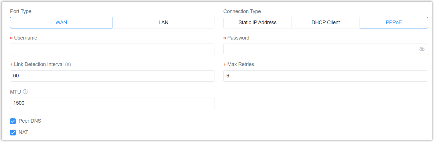 Parameter Description Username The username for PAP/CHAP authentication. Password The password for PAP/CHAP authentication. Link Detection Interval The interval to send heartbeat packets to detect the link status. Max Retries The maximum retry times if the dialing is failed. MTU The maximum transmission unit of the packets passing this interface. The actual MTU value is the configured value minus 8. Peer DNS Use the DNS server address of the peer. If disabled, it is necessary to configure the primary DNS server and secondary DNS sever manually. NAT Enable or disable NAT for this interface.
