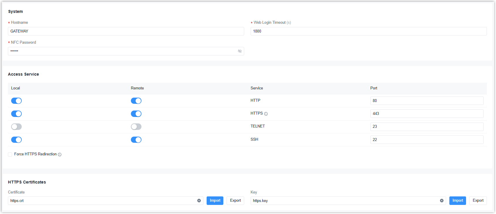 HTTPS Certificates Certificate The gateway has preloaded certificate and key files for HTTPS access. Import: Click to import customized files.