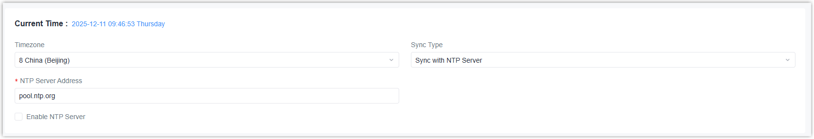 Parameter Description Current Time Displays the current device time. Timezone Select the time zone of the device. Sync Type Select the time sync source among Sync with Browser, Sync with NTP server or Set up Manually. Sync with NTP Server NTP Server Address Set the NTP server address (domain name/IP) to synchronize the time. This requires the gateway to be able to access this server. Enable NTP Server After enabled, the device can work as an NTP server to provide time to other connected devices. - Click Apply to save the settings.