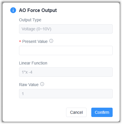 Custom Raw Value: Define a custom raw value to output.Description For noting this interface. Linear Function After enabled, the configured output value will be substituted into the function formula before being output. The formula: y=a*x+b(y: present value/configured value, x: raw value/real output value)