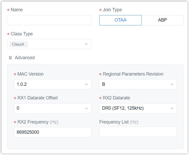 Parameter Description Name Define a unique device profile name. Join Type Select OTAA or ABP. Class Type Select Class B or Class C. Class A is permanently enabled. Advanced MAC Version Select the MAC Version of the end devices. Regional Parameters Revision Select the regional parameters version identifier for this profile.. RX1 Datarate Offset The offset used to calculate the RX1 data rate based on the uplink data rate. RX2 Datarate The data rate of RX2 window. RX2 Frequency The frequency of RX2 window. Frequency List Enter the factory-preset frequency values provided by the device vendor as a comma-separated list. Device Channel Allow end devices to communicate via specific frequency channels by entering the channel indexes. This feature only works with CN470/US915/AU915 channel plans. Examples: 1,40: Enable Channel 1 and 40