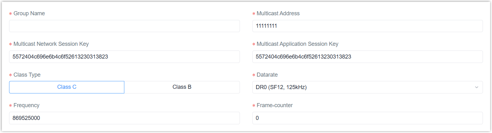 - Be configured with the same parameters: Class Type (Class B or Class C), Multicast Address, Multicast McNetSkey, Multicast McAppSkey, RX2 Datarate, RX2 Frequency, and application port.