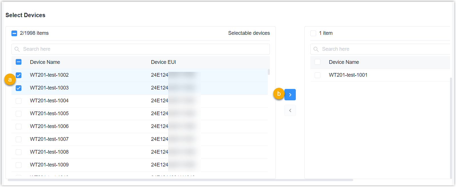 Ping Slot Periodicity The period for end devices to open the ping slot to receive messages for class B devices. - Select the devices to add to this multicast group. Typically, select devices of