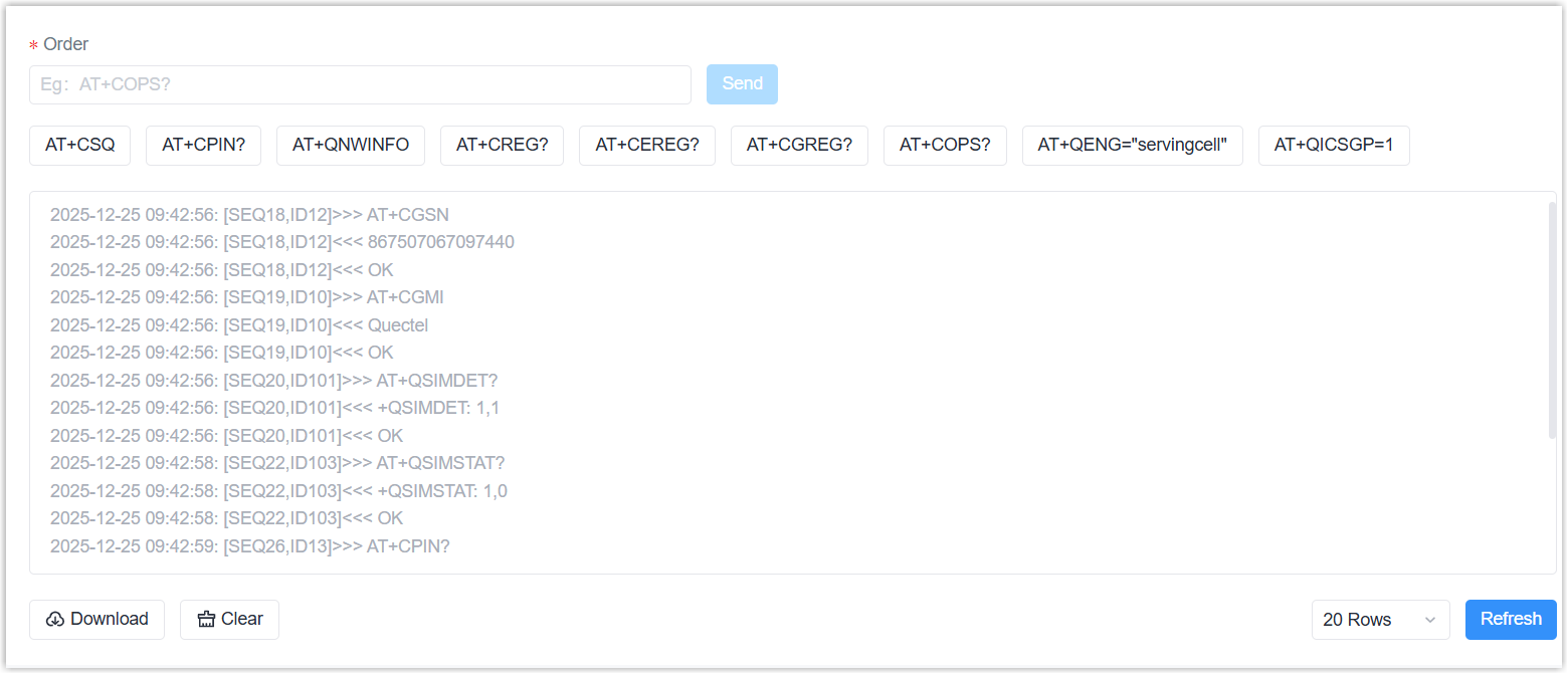 - Enter the AT commands, click Send. Or click the preset command buttons to send directly.