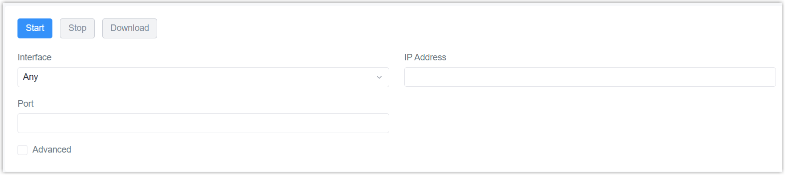 - Configure the packet capture conditions like interface, IP address or port. For more complex requirements, enable Advanced and enter the TCPDUMP command.