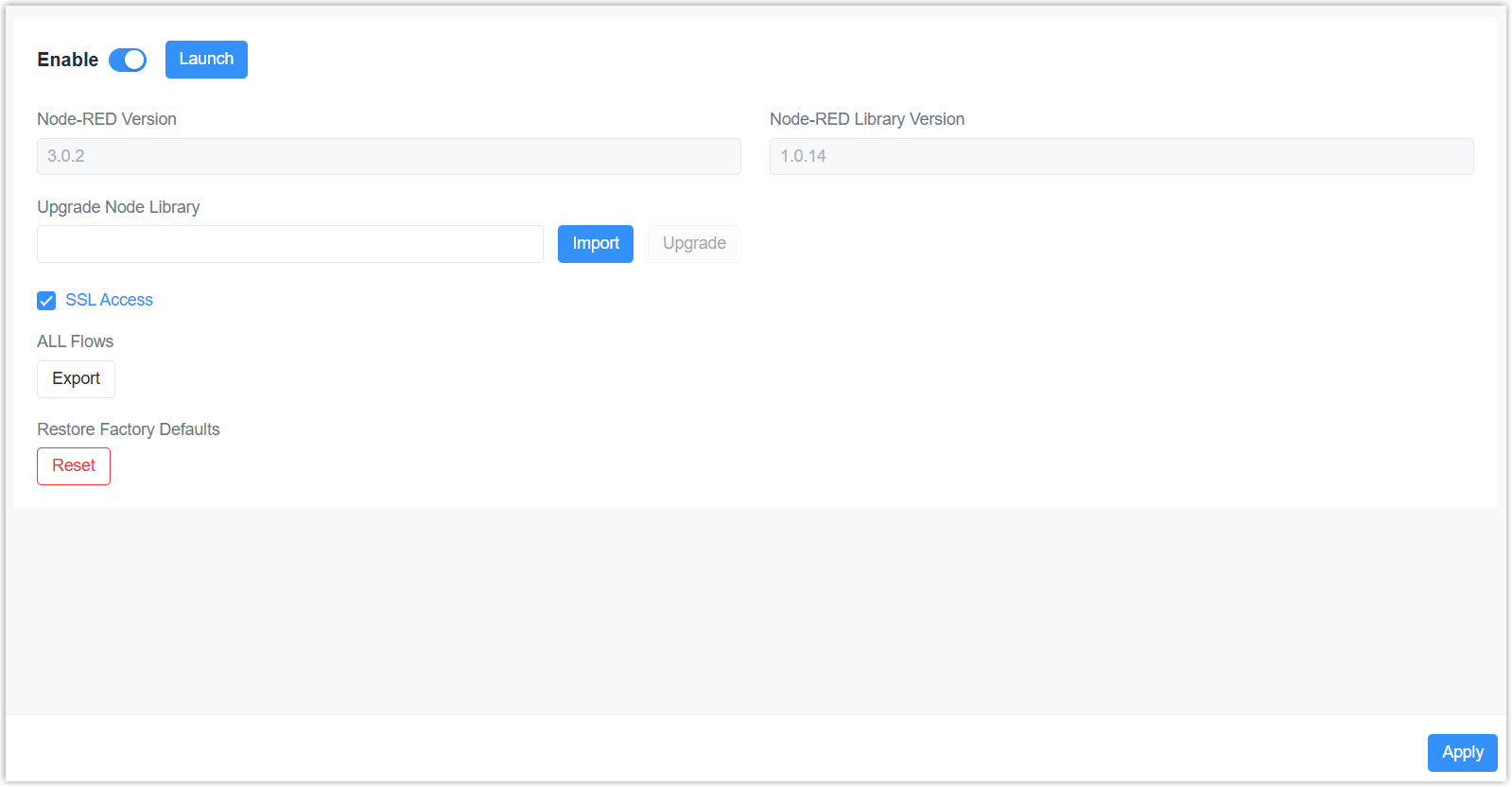 - Click Apply to save the settings and start the Node-RED.
