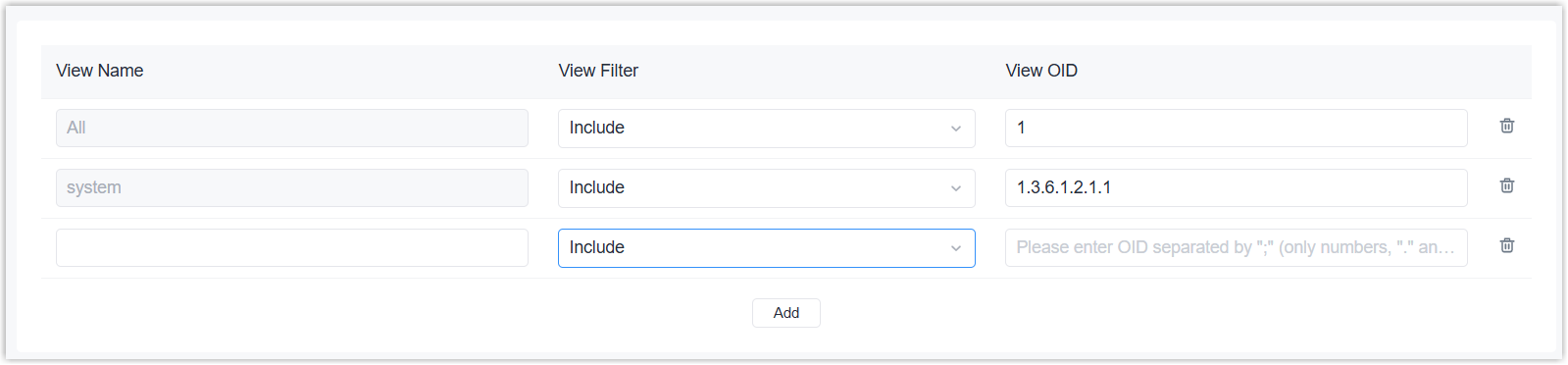 | Add | Add a MIB view. |