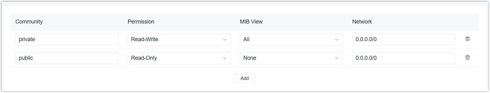 | Network | Enter the external IP address/subnet to allow to access this MIB view. 0.0.0.0/0 means all allows. |