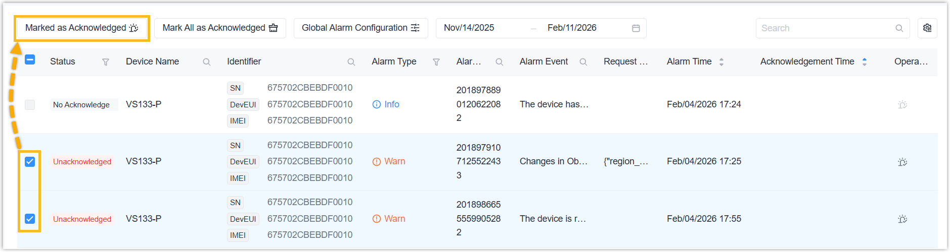 Acknowledge Alarms in Bulk: Select desired events and click Marked as Acknowledged to acknowledge alarm events, or click Mark All as Acknowledged.