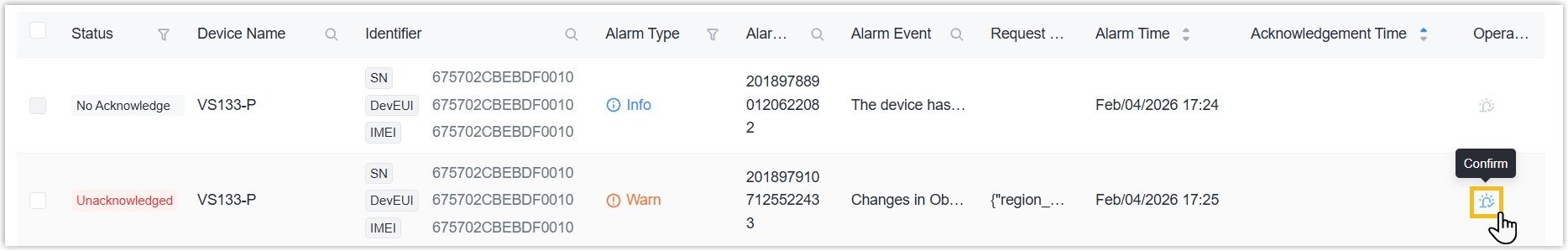 required.Acknowledge an Alarm: Click the alarm icon to acknowledge the desired alarm event.