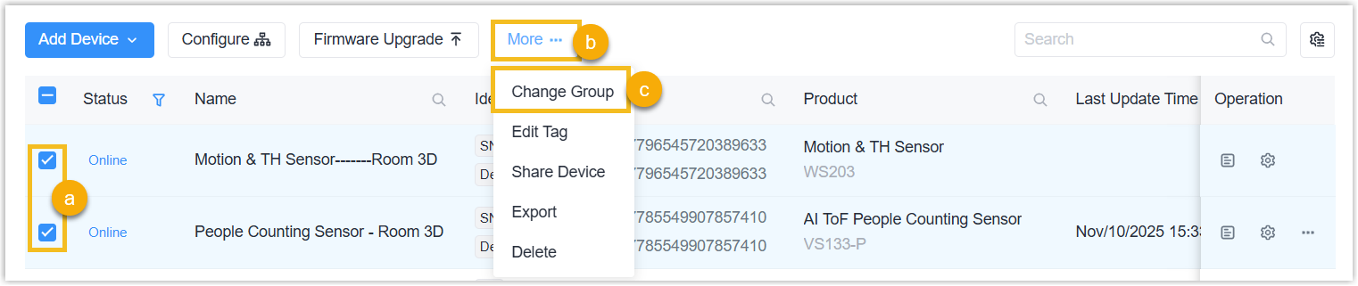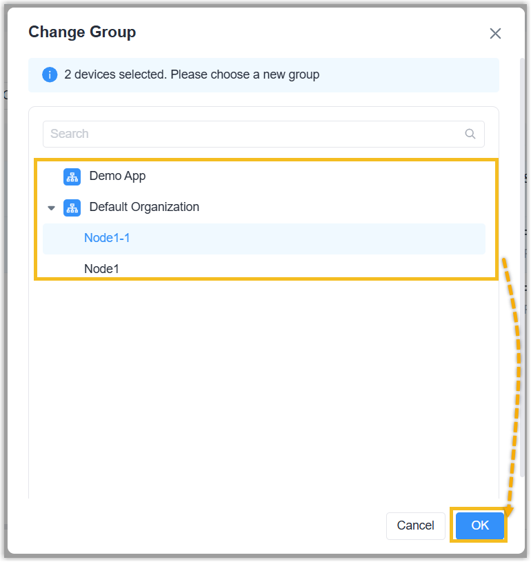The device(s) is moved to another group or sub-node, and is also moved to another application.