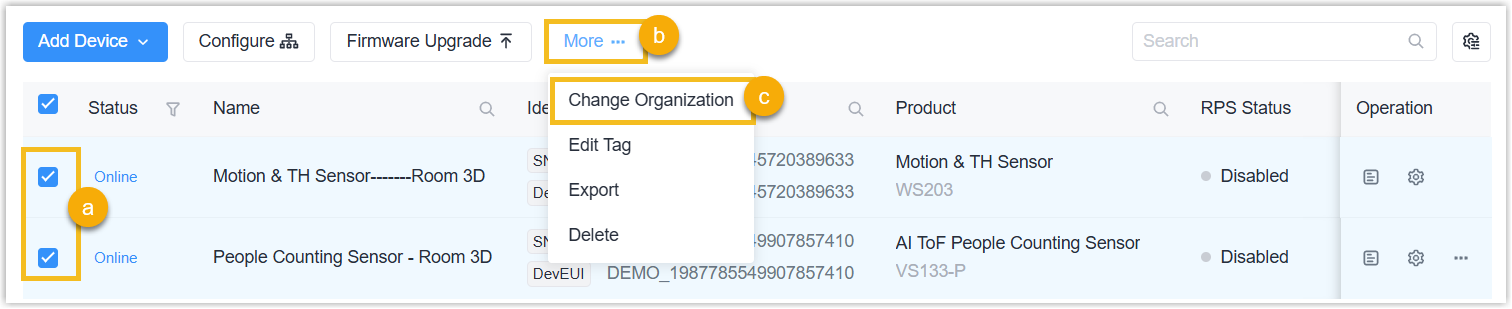 The device(s) is moved to another organization or sub-node. If it is removed to another organization, the device is also moved to another application.