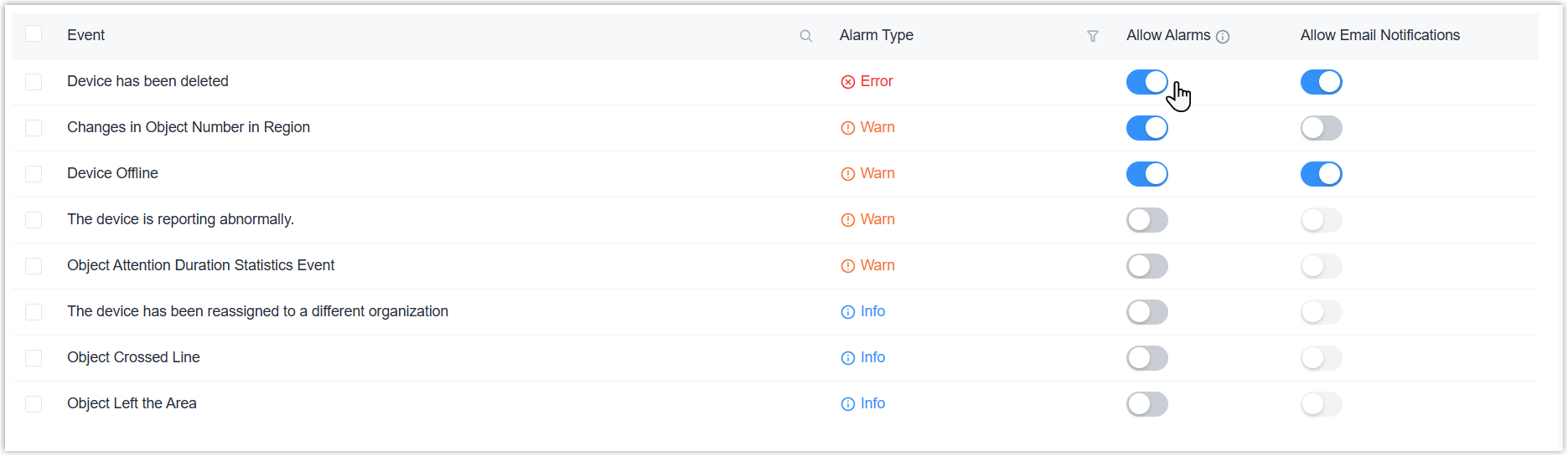 Configure in Bulk: Select desired events and click Batch Edit to enable or disable alarm events.
