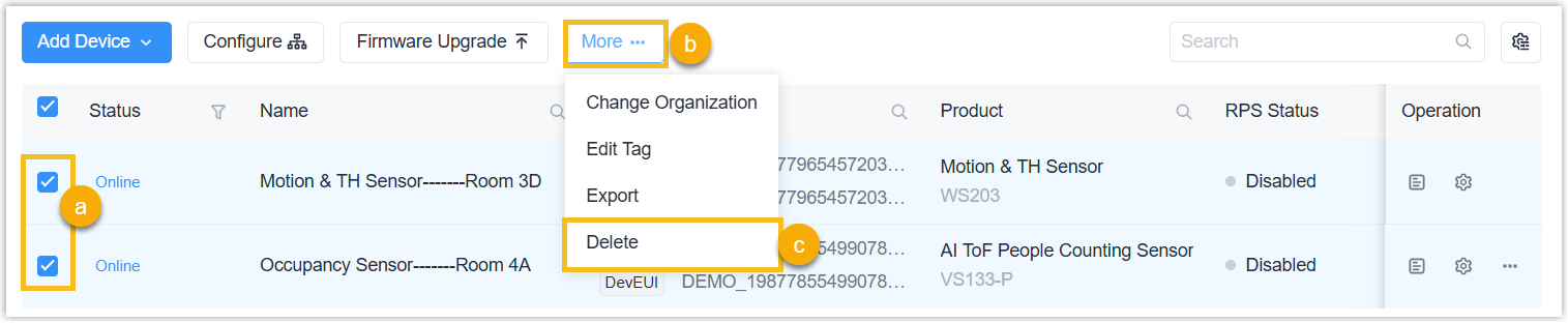 - The devices are deleted from both Application and Device page of Milesight Development Platform, along with the associated data and the corresponding RPS records. If you only need to delete the RPS records of the device, see Delete RPS Records.