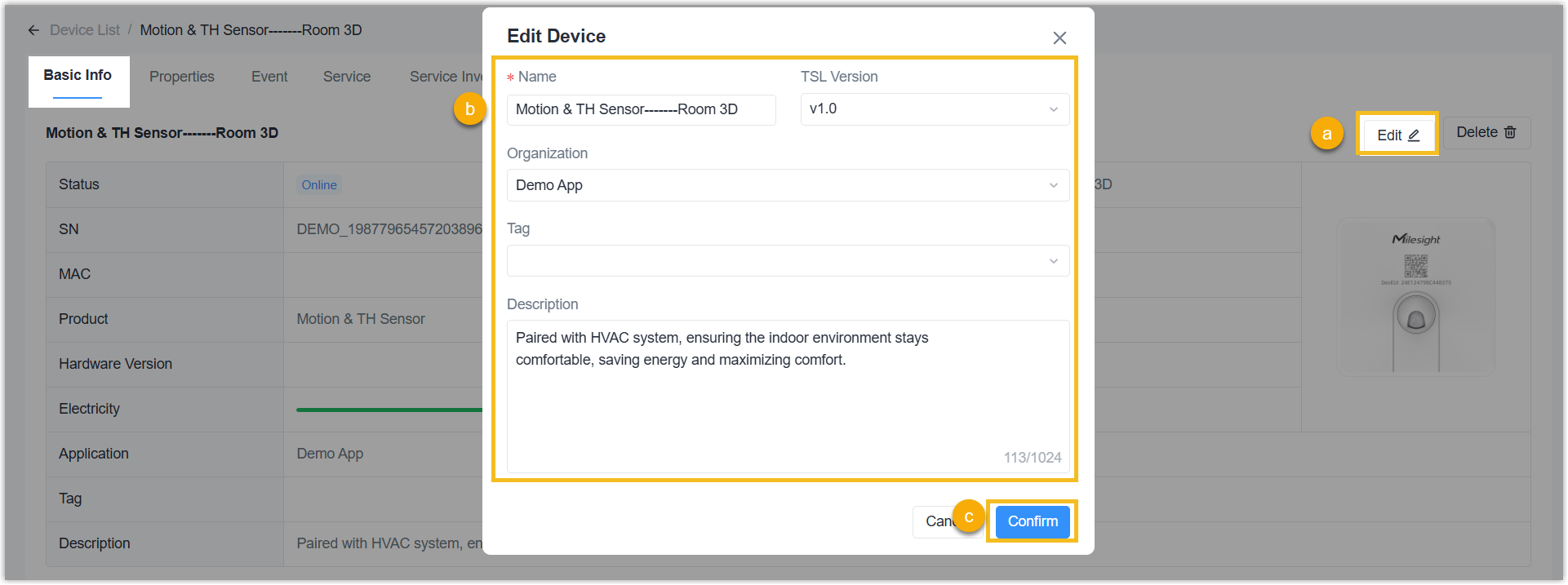 - Edit the device's name, TSL version, organization, tag, and description as needed.