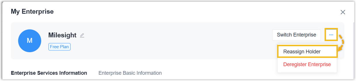The enterprise holder is assigned to another account, and current account switches to Organization Administrator of all organizations.