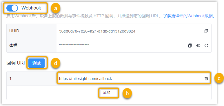- 输入用于接收事件通知Webhook的有效URL。注: 最多支持五个回调URI。
