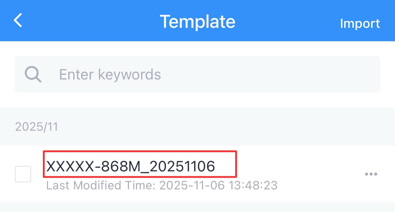 - Click Export in the lower left cornet to export this template as a JSON format file and save it to the smart phone.
