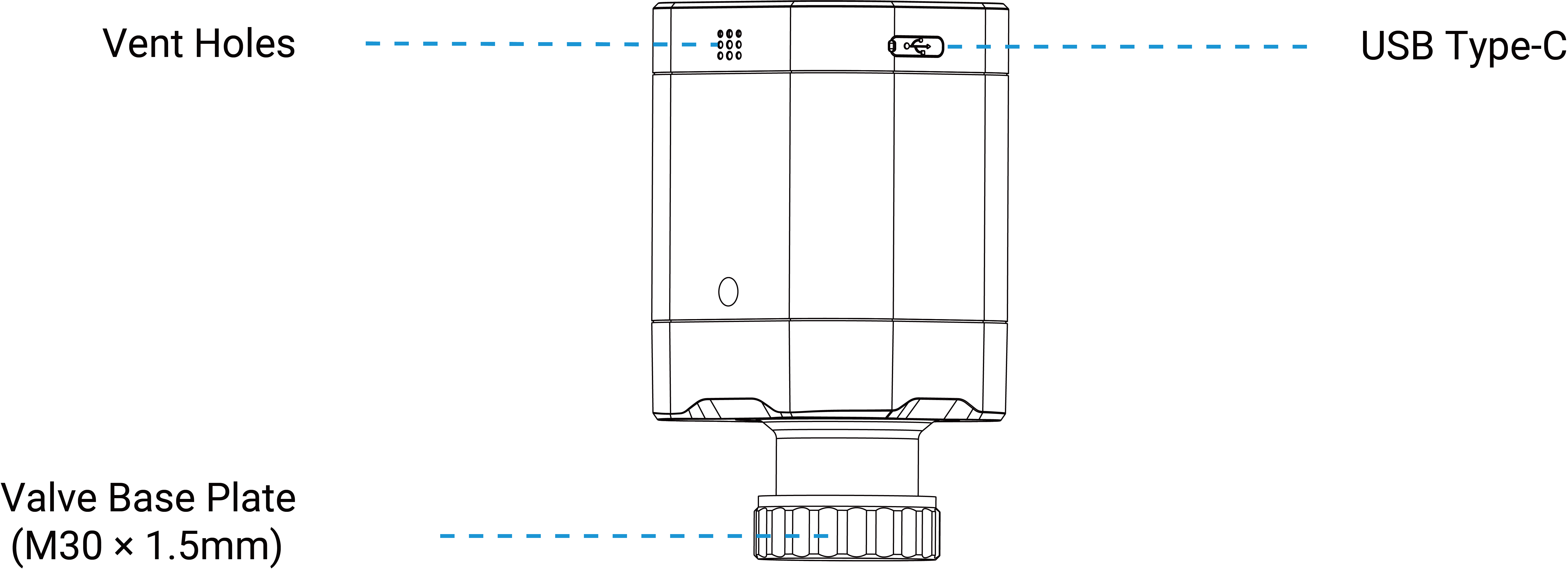 Part Description USB Type-C Used for power supply, charging or USB-C NTC sensor connection. Remove the dust cap before use. Vent Holes Allow external air to flow into the holes to ensure the timely and accurate temperature measurement of the internal NTC sensor. Valve Base Plate Used to fix onto a valve with a thread size of M30 × 1.5 mm. For other valve types, it requires mounting metal valve adapters on the valve first.