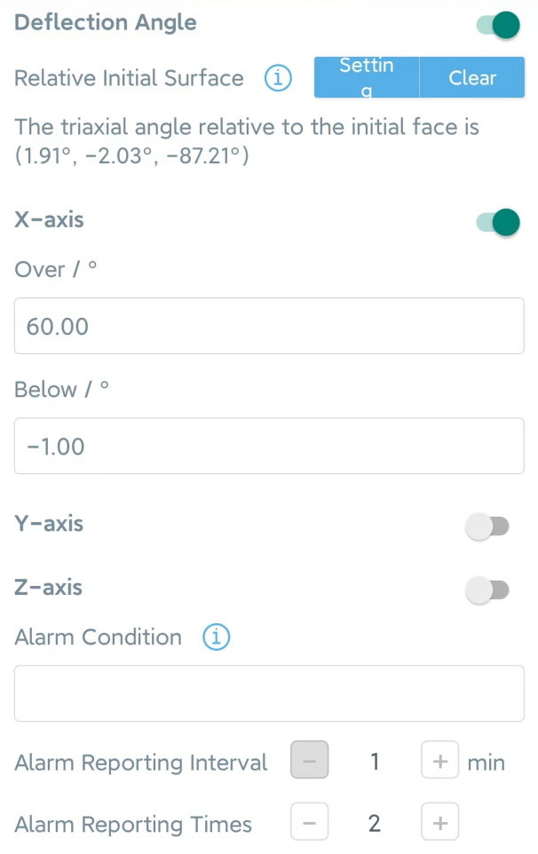 You can set a relative initial surface to measure the deviance from an initial one, when the device detects the angle of a certain axis reaches the threshold based on the initial position, it will upload the current data instantly.
