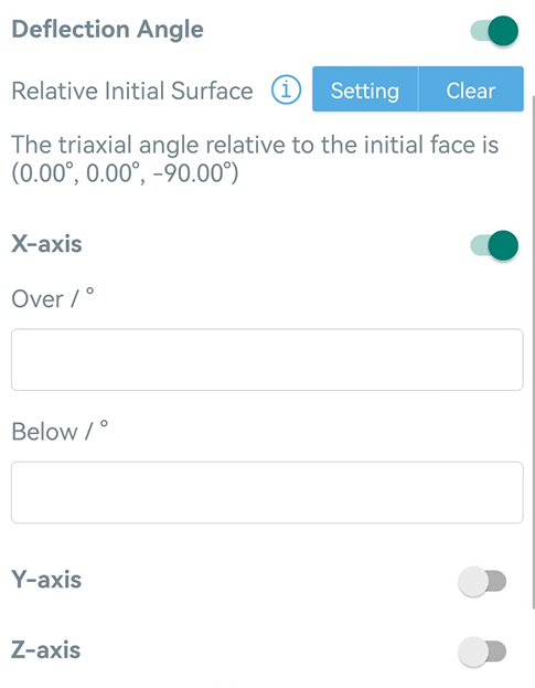 Click Setting to set current position of device as initial position to measure the deflection angle. Click Clear to change the initial position back to (0.00°, 0.00°, -90.00°). Note: after writing Setting or