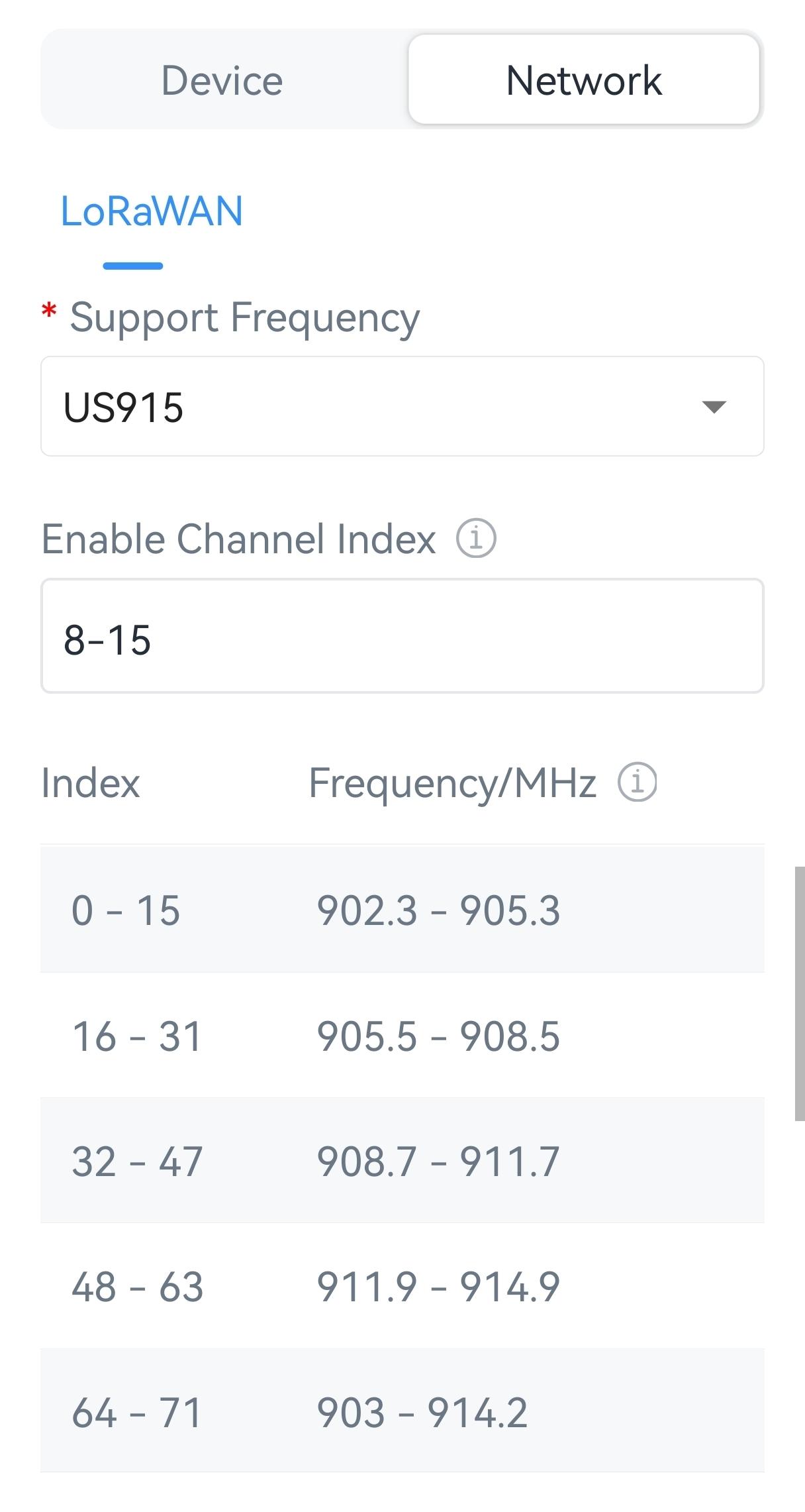 Note: Set the channel index as 8-15 for US915 or AU915 if using
