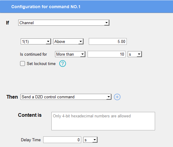 Send a D2D control command. When the IF condition triggers, UC100 can work as Milesight D2D controller to send a control command to control the Milesight D2D agent device. The command should be a 2-byte hexadecimal number.