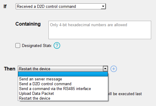 Received a D2D control commandand the Then as any action. When UC100 receives a Milesight D2D command, it can work as a Milesight D2D agent to restart the device, send a server message, send a Milesight D2D control command, send a command via the RS485 interface or upload a data packet.