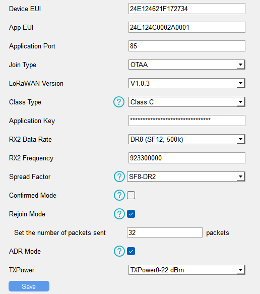 | App EUI | The default App EUI (join EUI) is 24E124C0002A0001. |