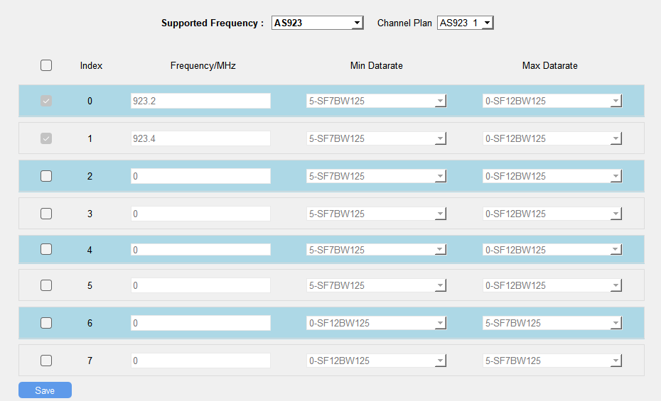 If frequency is one of CN470/AU915/US915, enter the index of the channel to enable in the input box, making them separated by commas.