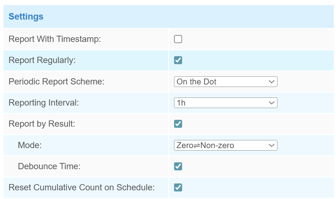 | Reset Cumulative Count on Schedule | Enable to periodically reset cumulative count on schedule. Support up