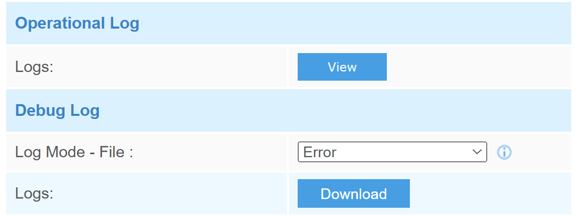 download for troubleshooting. Error: Records errors that are abnormal and affect critical functions. Debug: Records detailed internal operational and status information. Note: For regular use, please