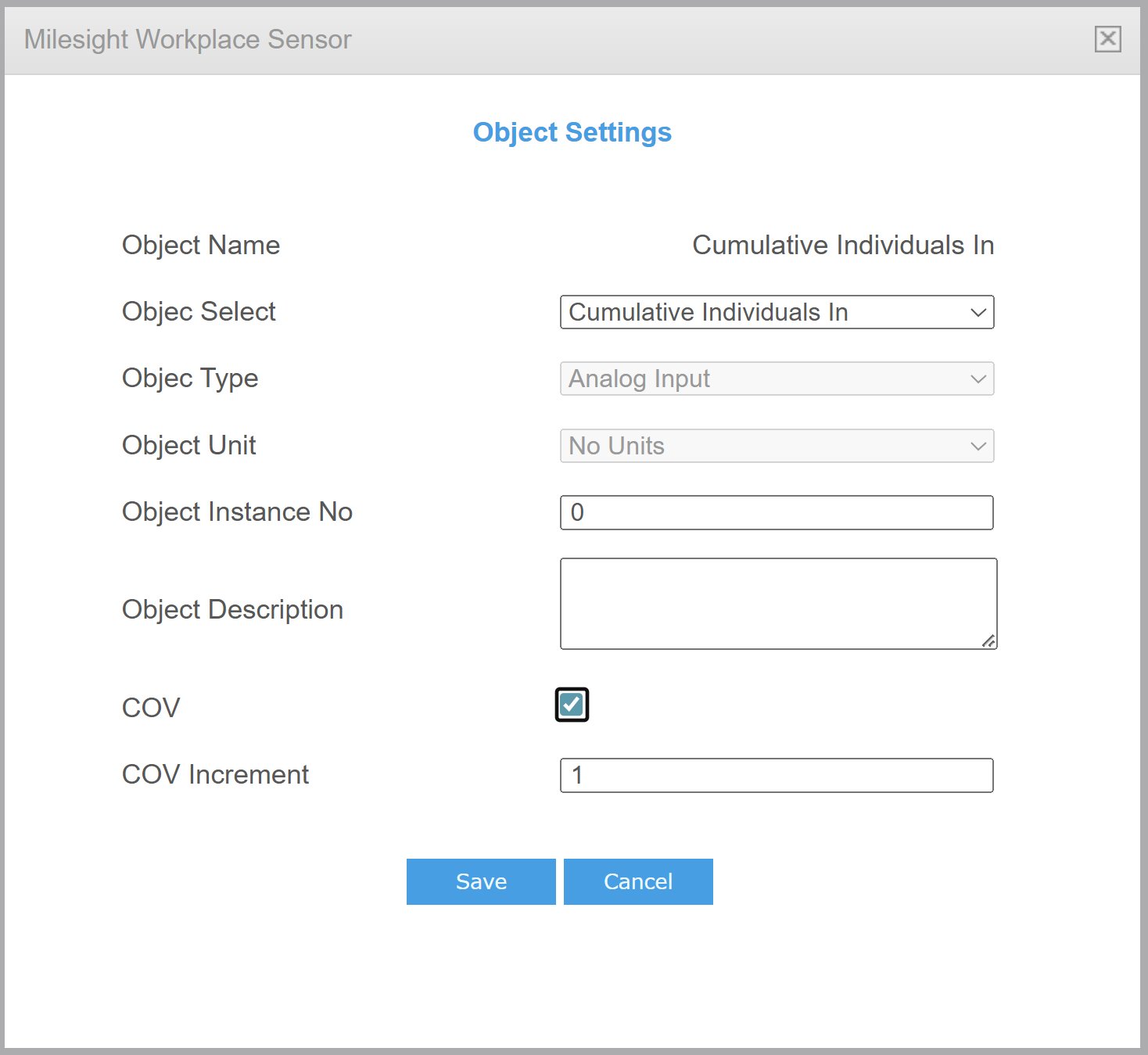 | COV | Enable, when object value changes, it will send notification of new value to BACnet client. |