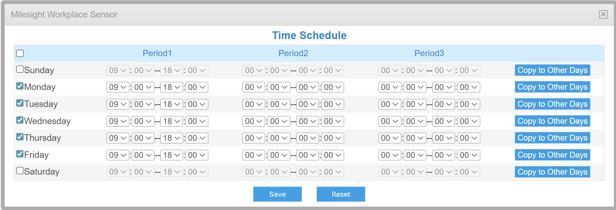 For example, as illustrated in the figure, if you select 9:00 AM to 6:00 PM from Monday to Friday, the device will only upload data within this time window. Data reporting will be disabled during all other periods. By clicking Copy to Other Days button on the right, you can copy all time periods at once, without having to modify each one individually.