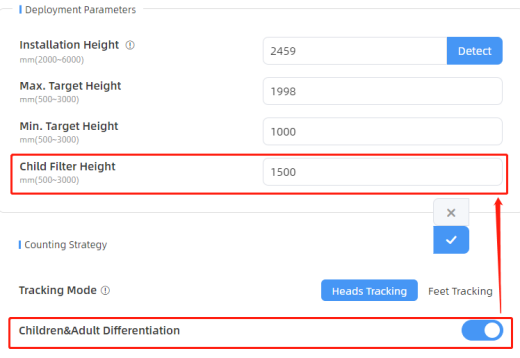 Step 1: Enable Children & Adult Differentiation, it will display the development parameters for child filter height.
