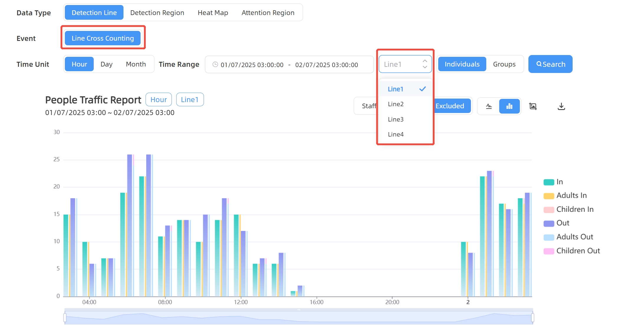 Users can draw detection lines to count the number of people entering or exiting.