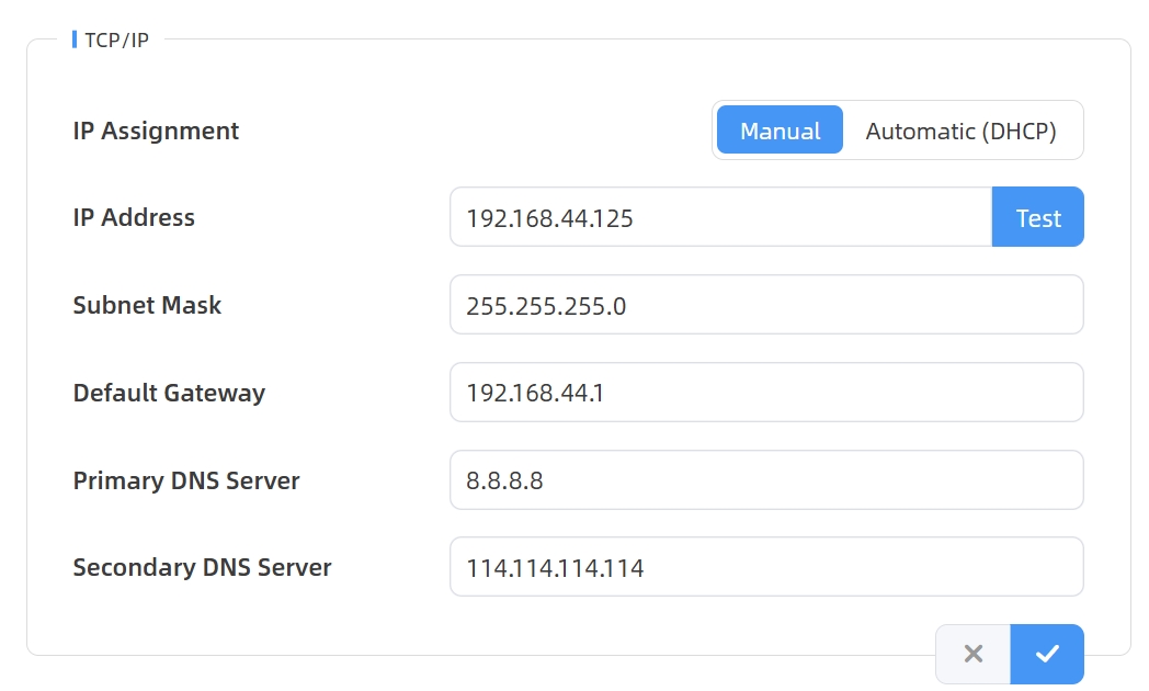 | IP Assignment | Manual or Automatic (DHCP) is optional. |