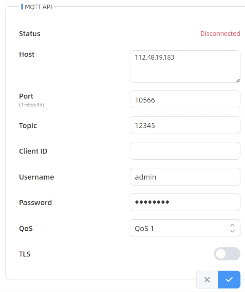 | Topic | Topic name used for publishing. These strings will be replaced with device info when subscribing to a topic: $devsn:Device SN $prdmd:Product Model $devid:Customized Device ID $siteid:Customized Site ID ![]() |