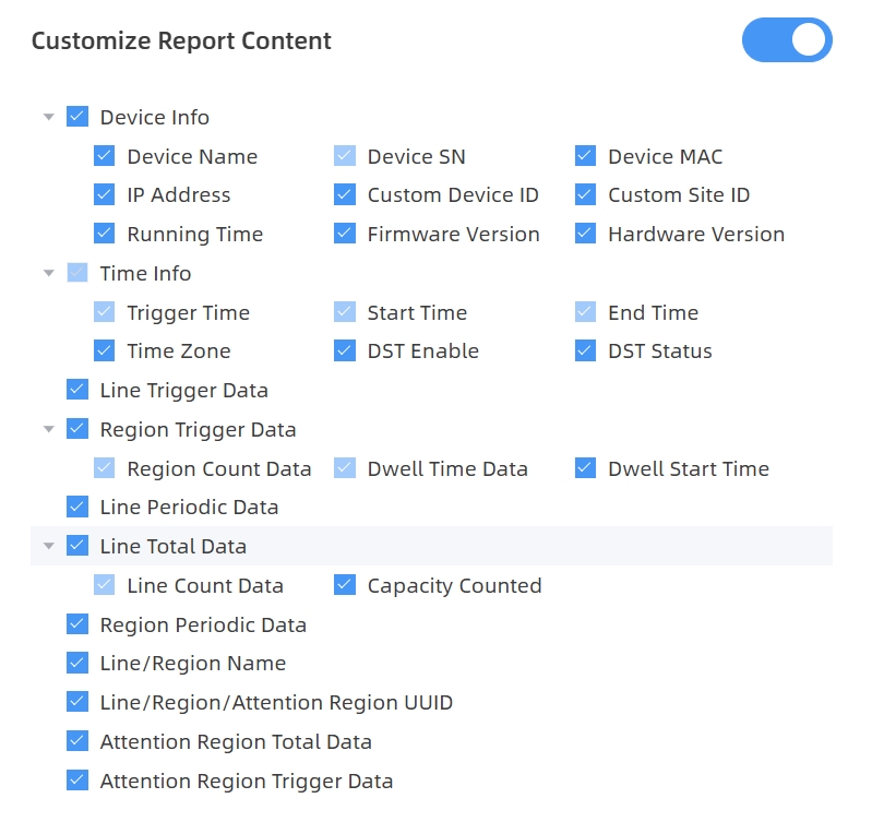| Trigger Report | Report immediately when there is a change of the line crossing people counting number or region people counting number. |