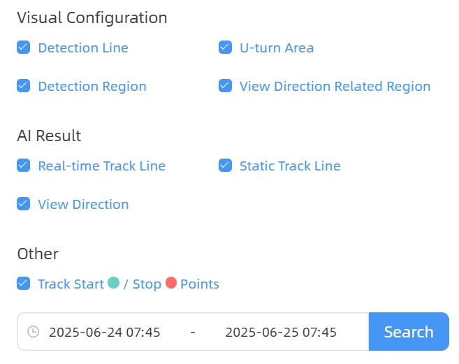 hide the lines, areas and track points as needed. Real-time Track Line: Show or hide the target's track line through the live view. Static Track Line: Show or hide the history of the target's track line in the live view. Supports up to 1000 historical tracks, which will disappear when you refresh the page. ![]() Note: If some